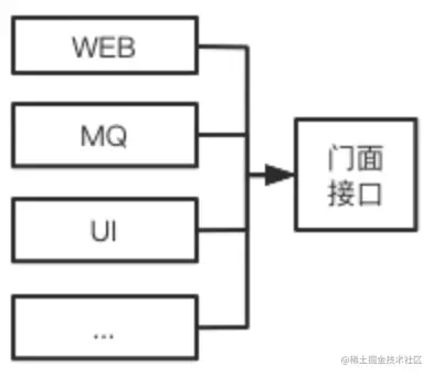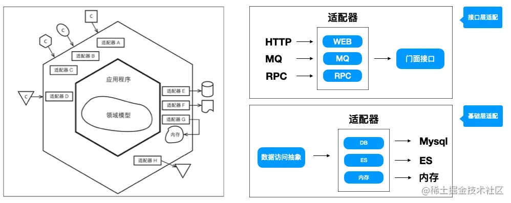 六边形架构,对于每种外界类型,都有一个适配器与之相对应。业务核心逻辑被包裹在内部,外界通过应用层API与内部进行交互,内部的实现无须关注外部的变化,更加聚焦。在这种架构下还可以轻易地开发用于测试的适配器。 同时六边形架构又名“端口适配器架构”, 这里的端口不一定指传统意义上的服务端口,可以理解为一种通讯方式,比如在一个服务中,我们可能会提供给用户浏览器的基于HTTP的通讯方式,提供给服务内部的基于RPC的通讯方式,以及基于MQ的通讯方式等,适配器指的是用于将端口输入转换为服务内部接口可以理解的输入。