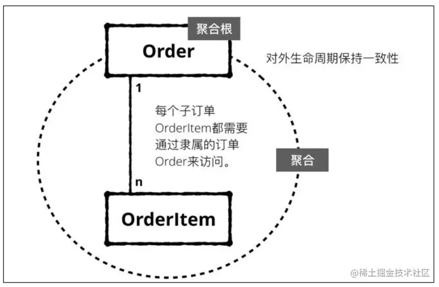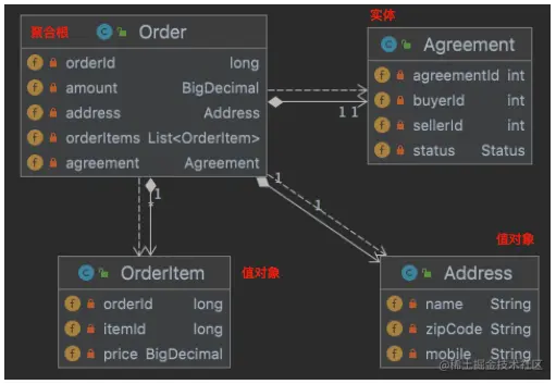 比如在上图中描述的是一个订单聚合,在这个聚合中,它里面有两个实体,一个是订单一个是退货退款协议,显然退货退款协议应该依托于订单,但是它也符合实体的特征,因此被定义为实体。在此情况下,订单实体就是此聚合的聚合根。