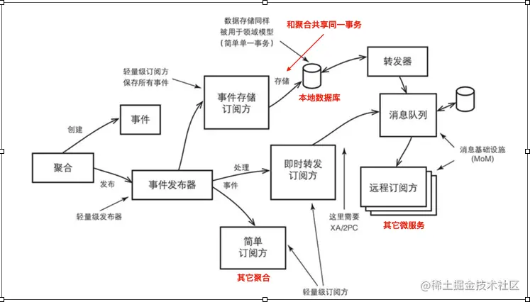 - 直接进行转发到消息队列,但是此时因为事件还未入口,因此需要在聚合事务与消息队列发布事件之间做XA的2PC事务提交,因为有2PC存在,通常性能不会太好。