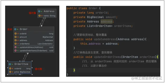 除了订单商品外,收获地址也是一个值对象,那么收获地址可以是一个实体吗? 答案是可以的,当业务在收获地址管理的上下文语境里的时候,收获地址就是一个实体。