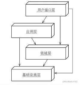 如果读者没有使用过DDD可能对此理解不是很直观,可以将用户界面层想象为Controller,应用层与领域层想象为Service,基础设施层想象为Repository或者DAO,可能会好理解一些