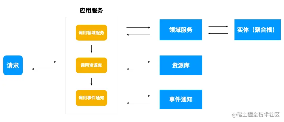 应用服务负责流程编排,它将要实现的功能委托给一个或多个领域对象来实现,本身只负责处理业务用例的执行顺序以及结果的拼装同时也可以在应用服务做些权限验证等工作。