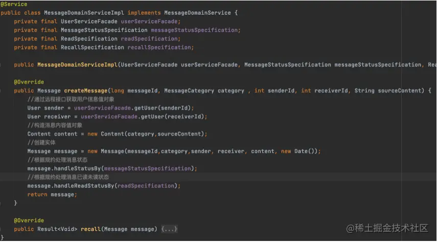 领域服务可以帮助我们分担实体的功能,承接部分业务逻辑,做一些实体不变处理的业务流程,它不是必须的。 在上图中,描述的是一个创建消息的领域服务,因为消息的实体中有用户的值对象,但是用户的信息通常在另一个限界上下文,也就是另一个微服务中,因此需要通过一些facade接口获取,如果把这些接口的调用防在领域实体 中就会导致实体过于臃肿,且也不必保持其独立性,因为它需要被类似于Spring这样的框架进行管理,依赖注入一些接口,因此通过领域服务进行辅助是一种很好的方式。