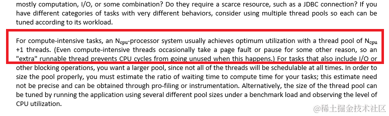 即对于计算密集型的任务,在拥有N个处理器的系统上,当线程池的大小为N+1时,通常能实现最优的效率。(即使当计算密集型的线程偶尔由于缺失故障或者其他原因而暂停时,这个额外的线程也能确保CPU的时钟周期不会被浪费。)