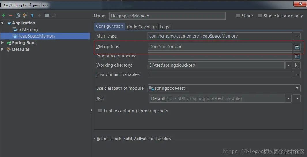 2,最大最小内存各设置为5M -Xms5m -Xmx5m