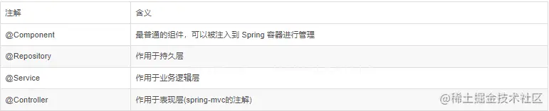 @Component:通用的注解,可标注任意类为 Spring 的组件。如果一个 Bean 不知道属于哪个层,可以使用@Component注解标注。@Repository:对应持久层即 Dao 层,主要用于数据库相关操作。@Service:对应服务层,主要设计一些复杂的逻辑,需要用到 Dao 层。@Controller:对应 Spring MVC 控制层,主要用来接受用户请求并调用 Service 层返回数据给前端页面。@Configuration:声明该类为一个配置类,可以在此类中声明一个或多个@Bean方法。