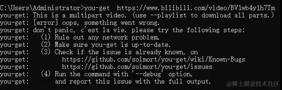 不过近期测试发现,B站视频通过you-get获取,好像有些问题,报错如下。虽然在某乎上找到了几个答案,比方说升级pip,升级you-get,换网络,重启电脑等,都不管用。