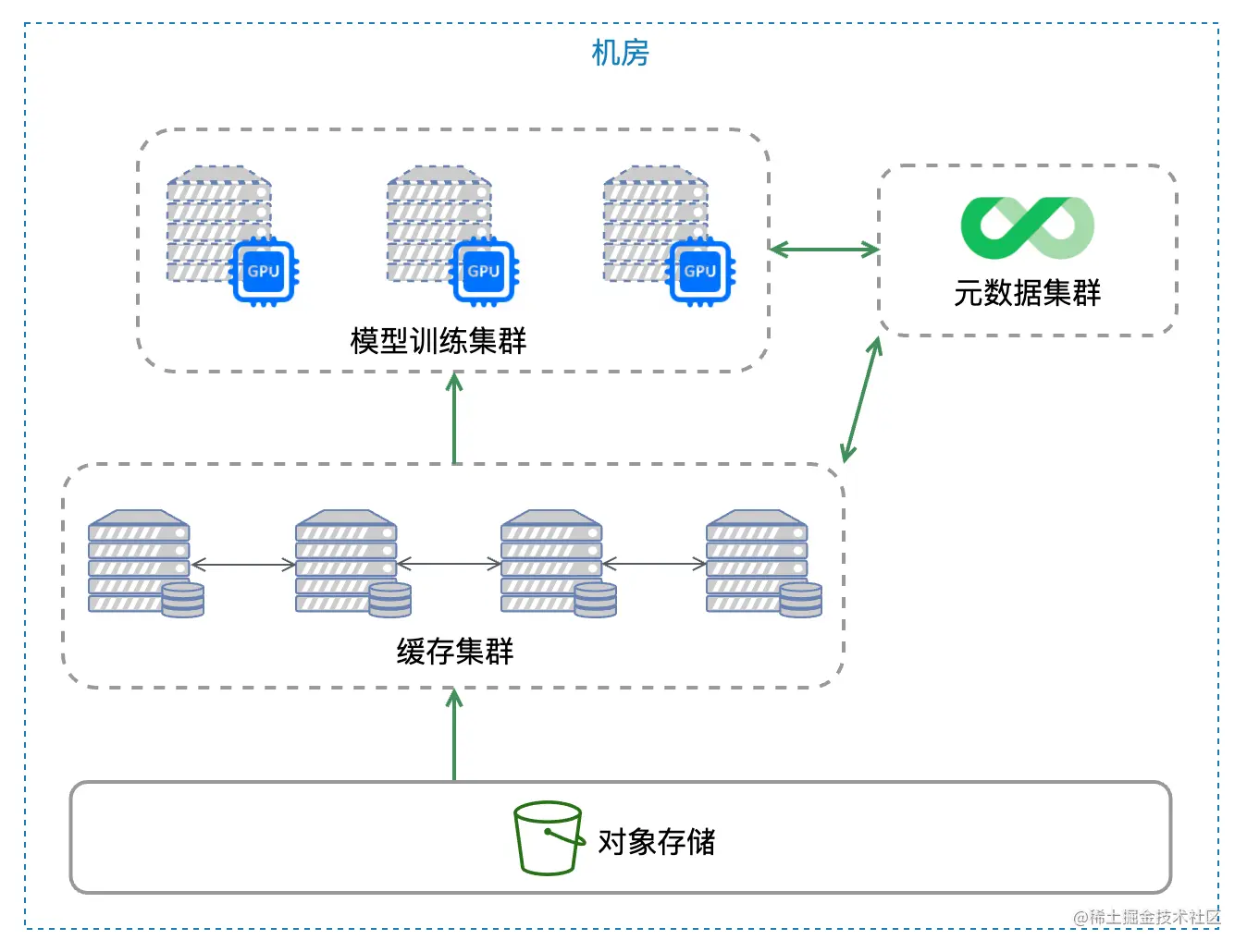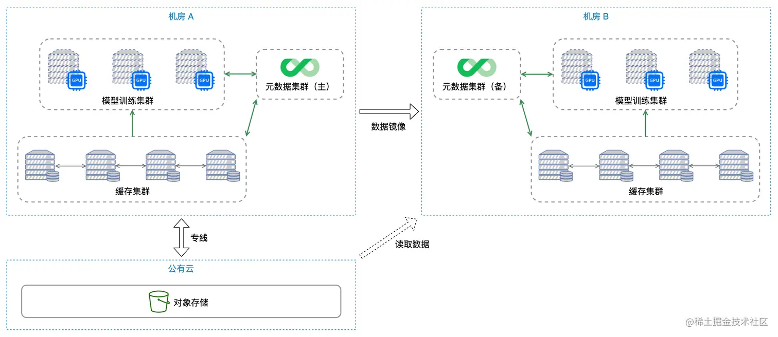 下图是本案例的整体架构图,在机房 A、B 中都部署了 JuiceFS 的元数据集群以及对应的独立缓存集群,模型训练时将会优先通过缓存集群读取数据集,如果缓存没有命中再从对象存储读取数据。在实际测试中,因为缓存命中率非常高,机房 B 几乎不需要跨机房访问对象存储。