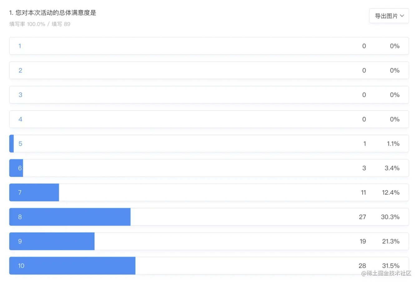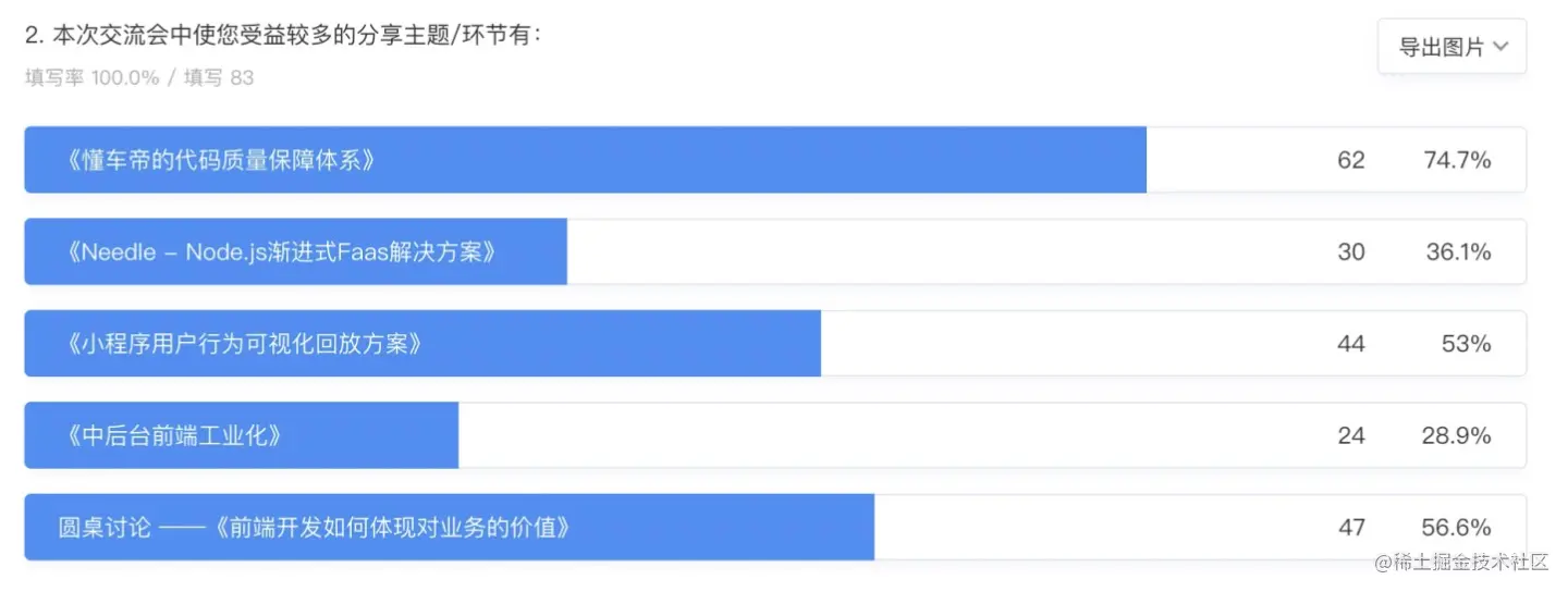本次大会一共设计了四大技术主题和一个圆桌会议,所有嘉宾分享主题的投影材料链接已放至文末。对演讲材料感兴趣的朋友可自行前往下载。会后调查统计显示来自字节跳动-懂车帝前端团队的嘉宾段瑜斌分享的《懂车帝前端代码质量保障体系》和圆桌论坛最受欢迎。从调查结果可以看出重庆地区开发者目前最关心的还是学习成长方面的话题。总体来说,交流会现场气氛活跃、积极提问、互动频繁,大家都表示收获了满满干货。