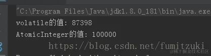 这个程序我们跑了10个线程同时对volatile修饰的变量进行10000的自增操作(AtomicInteger实现了原子性,作为对照组),如果volatile变量是并发安全的话,运行结果应该为100000,可是多次运行后,每次的结果均小于预期值。显然上文的说法是有问题的。