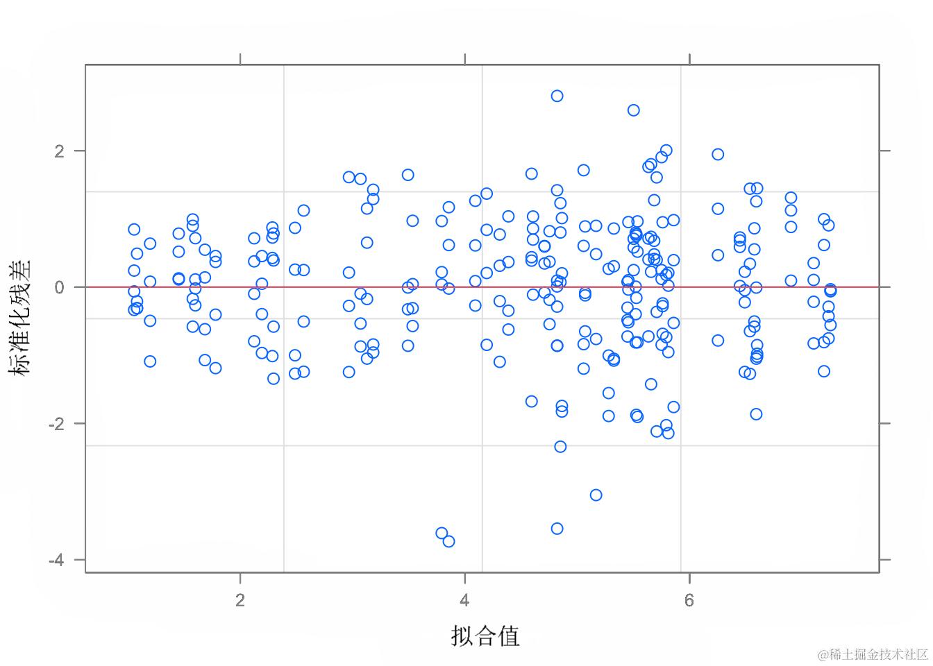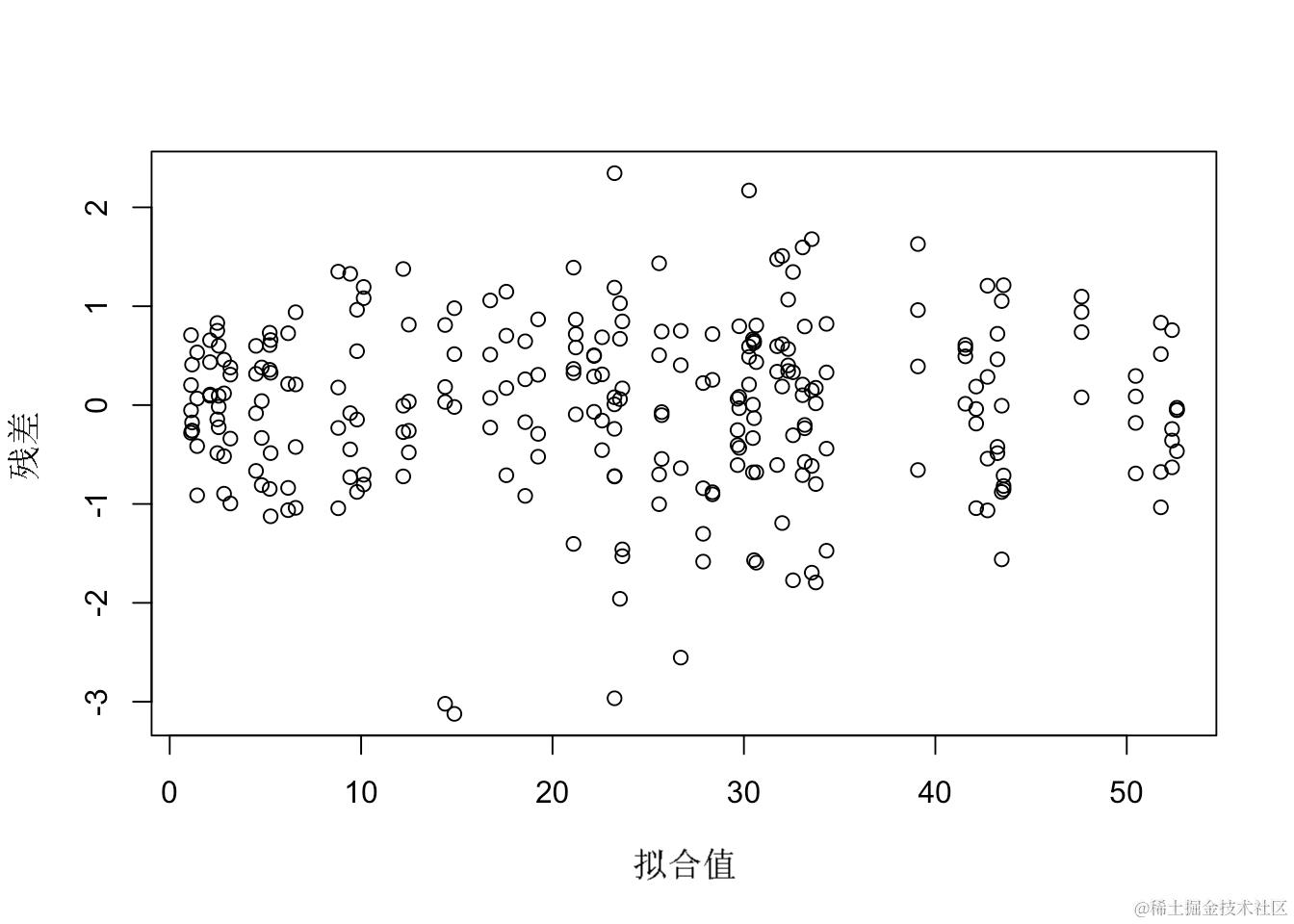 这个模型对于其他情况(无区块和无重复测量)可能是有用的,但在我们的例子中是错误的。事实上,观测值在区块和地块内是聚在一起的;如果忽略这一点,我们就违反了模型残差独立的假设。残差与拟合值的图显示,不存在异方差的问题。
