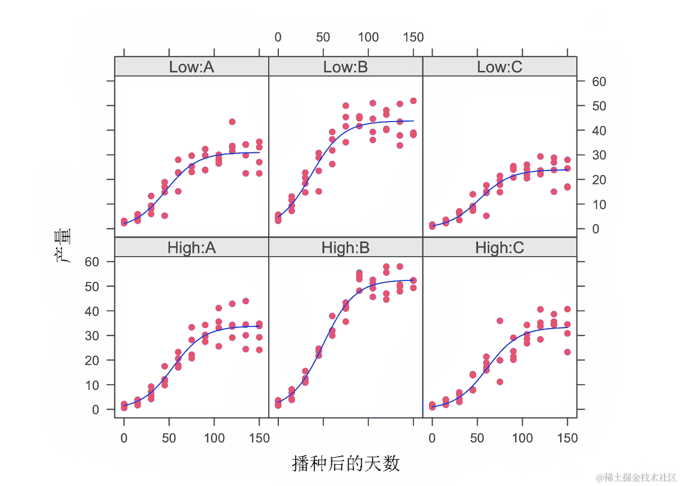 让我们考虑一个实验,在该实验中,我们在完整的区组因子设计中以两种氮含量(“高”和“低”)测试了三种基因型(为了简便起见,我们称它们为 A、B 和 C),并进行四次重复。在八个不同的时间(播种后天数:DAS)从 24 个地块中的每一个中取出生物量子样本,以评估生物量随时间的增长。