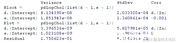 从上图中,我们看到整体拟合良好。随机效应的固定效应和方差分量按如下方式获得: