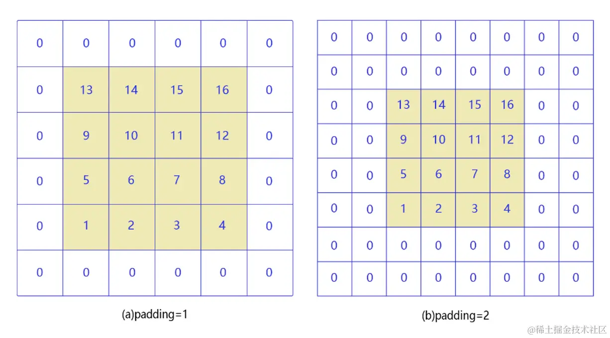那么出现的一个解决办法就是填充操作,在原图像外围以0进行填充,在不影响特征提取的同时,增加了对边缘信息的特征提取。