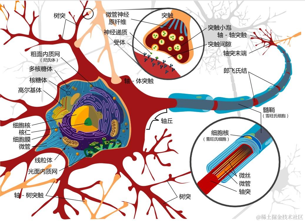电脉冲沿着轴突并通过突触传递到其它神经元。为了模拟神经细胞行为,与之对应的感知机基础概念被提出,如权量(突触)、偏置(阈值)及激活函数(细胞体)。