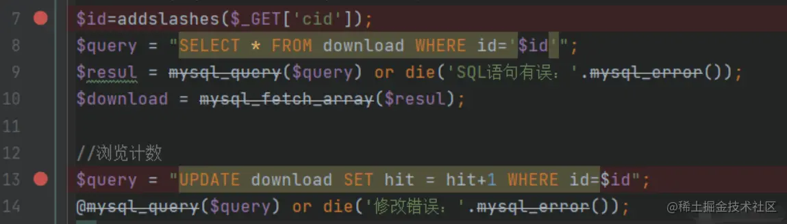 然后继续往后看,点击下载会跳转到files/content.php,跟进,发现存在SQL注入漏洞,