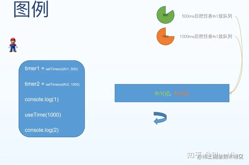 计时器就属于异步任务的一种,也就是当代码开始运行时,遇到函数声明不管,先碰到的可执行的代码是timer1,由于它是异步任务,所以挂在一边让他自己玩去;然后碰到了第二个可执行代码timer2,同样的,也是放在一边;接下来是console.log(1),所以立马输出1;遇到函数,需要执行2000ms;接下来,执行代码console.log(2),输出2。这时放在旁边的两段代码已经执行完毕,并且将他们的结果放在了任务队列里,此时主线程继续执行任务队列的任务,并同步返回3和4.