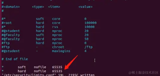 我们可以在Linux服务器里面修改这个数量,首先先输入vi /etc/security/limit.conf文件,在最后做如下配置(这里以设置参数危65535为例),然后保存: