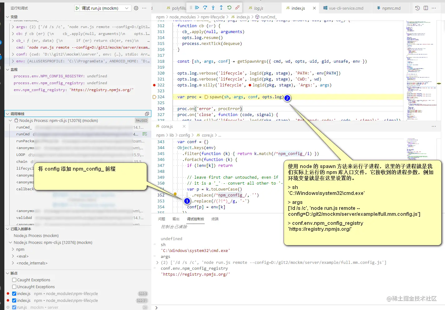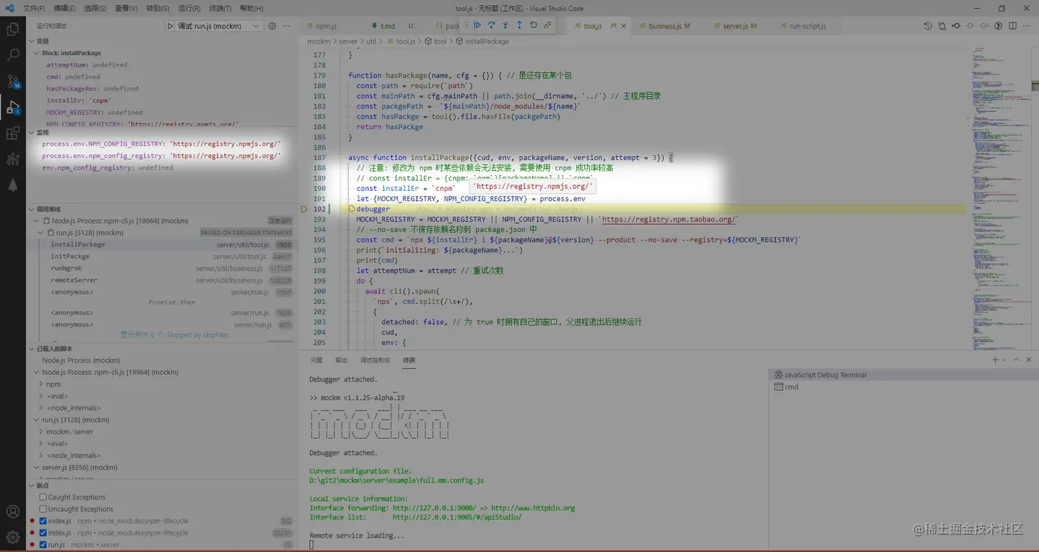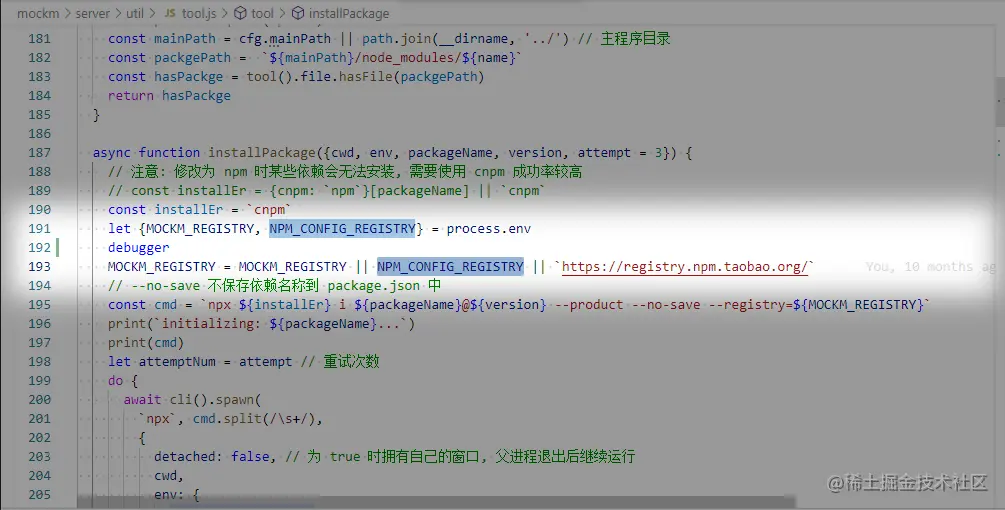 首先我们在 mockm 这个前端接口联调工具的源码中先来个 debugger, 注意有从 process.env 中获取 NPM_CONFIG_REGISTRY 这个环境变量,这是 npm 安装时可配置的镜像地址。