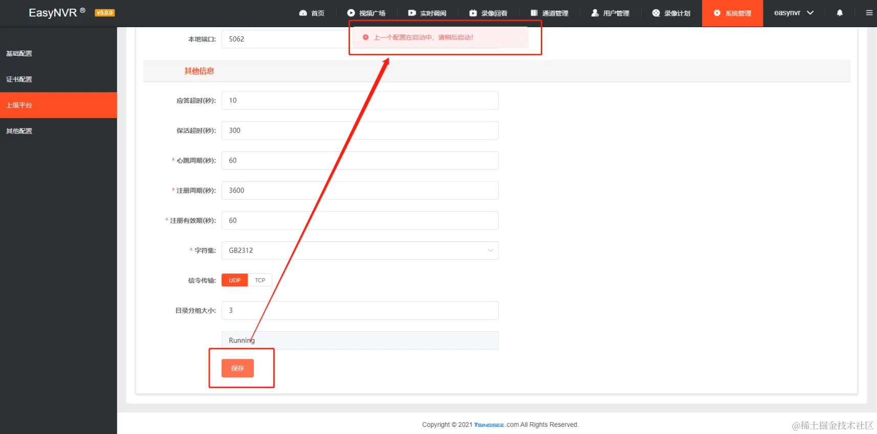 1.EasyNVR国标级联保存配置时会一直提示:上一个配置在启动中,请稍后启动!