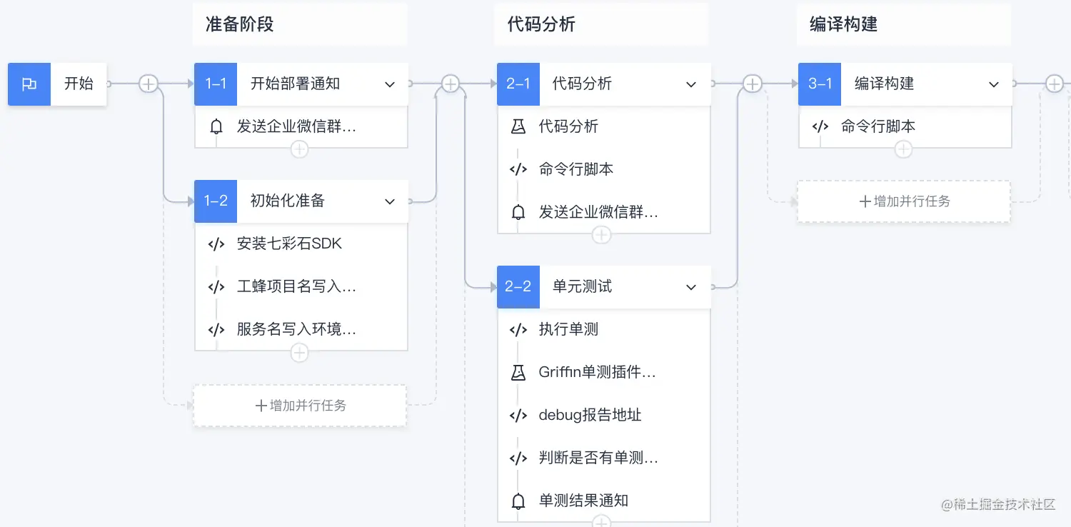这里主要使用了 coding 平台,为了区分不同环境,建立了开发、测试、预发布、测试四套不同流水线模板,还引入了合流机制来加入人工 code review 阶段。