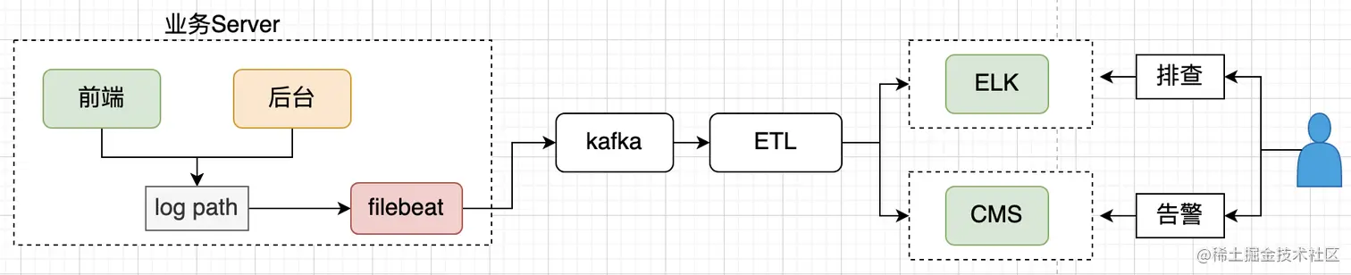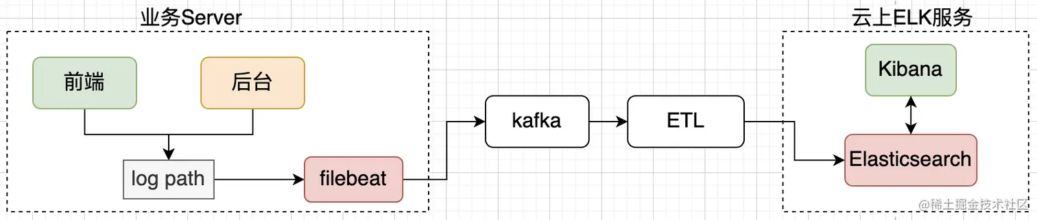 调研云上有成熟的 elk 服务,业务只需要把日志放到同一目录,通过 filebeat 采集后,通过 ETL 逻辑可以把日志方便导入 Elasticsearch。这样的做法还有个优点就是可以同时支持前后端服务日志的采集,技术较为成熟,复用了组件能力,通过在请求中埋点加入 traceid,方便在全链路定位问题。