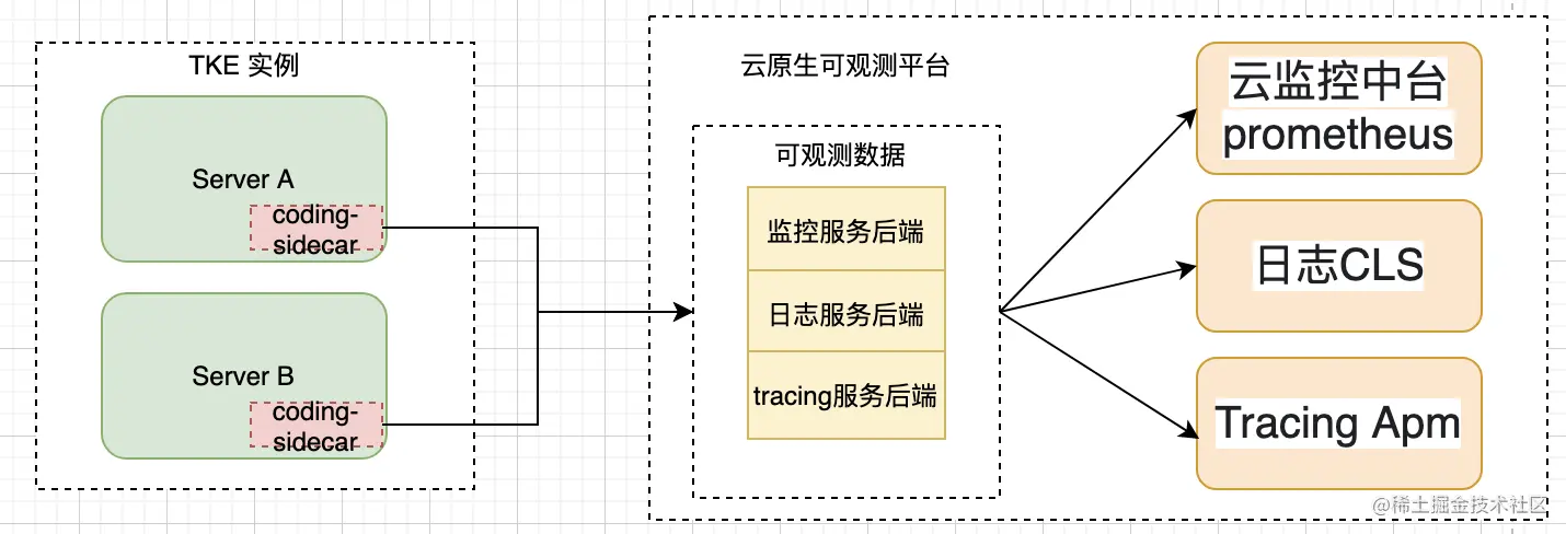 stage4:初期使用基于日志的方式来做(log/metric/tracing),满足了业务快速上云、问题排查效率提升的初步述求,但随着业务规模增长,愈加庞大的日志流占用了越来越多的资源,日志堆积在高峰期成为常态, CMS 告警可能和实际发生时已经间隔了半个小时,ELK的维护成本也急剧上升。云原生的可观测技术已经成为必要,这里我们引入了 Coding 应用管理所推荐的可观测技术方案,通过统一的 coding-sidecar 对业务数据进行采集: