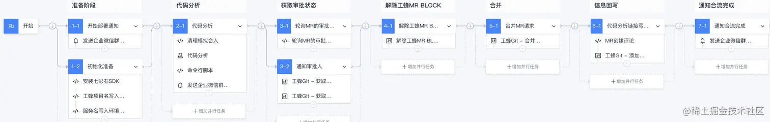 在合流阶段:通过 MR HOOK,自动轮询 code review 结果,确保代码在 review 通过后才能进行下一步(不同团队可能要求不一样)。