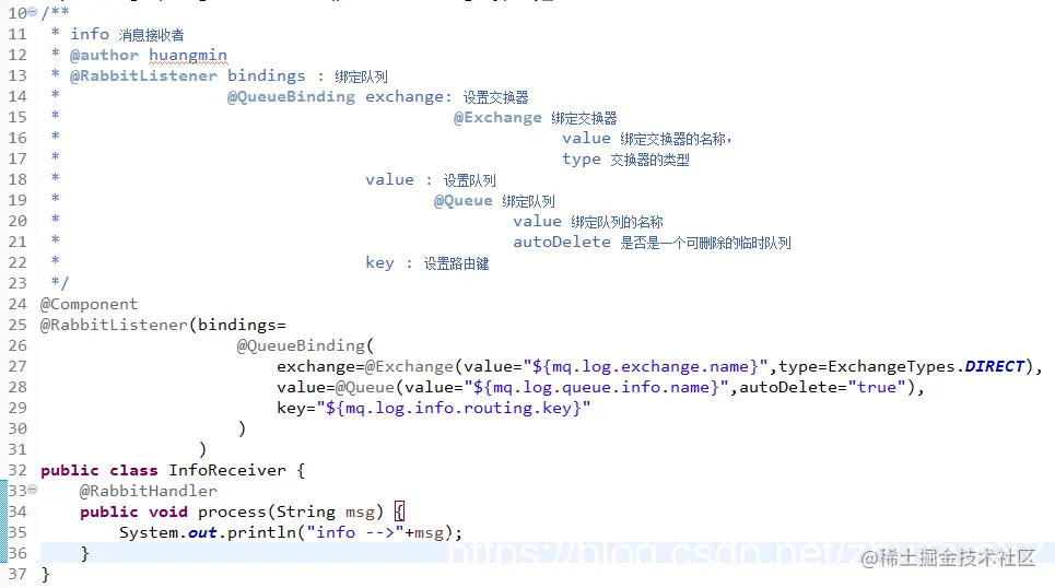 通过注解 @RabbitListener 将配置的交换器、队列、路由键绑定