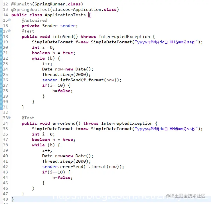 运行上面的2个测试方法,都是每隔2秒,共发送10次消息,控制台输出如下