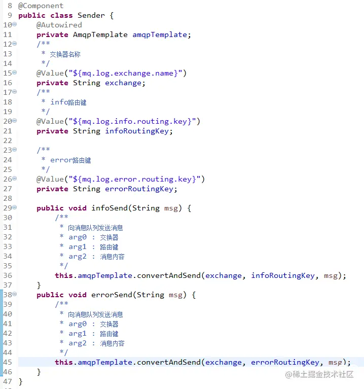 Sender.java 设置相应的交换器、路由键。