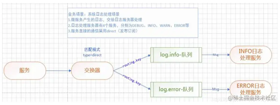 本实例通过配置不同的日志级别的路由键来发送和接收信息。