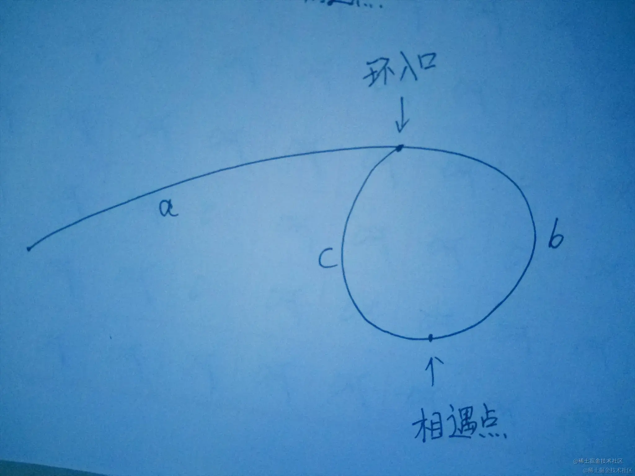 经过一系列化简,我们可以得到a == (k-1) × (b+c) + c,而上面我们说过,(b+c)就是链表中环的长度,所以这个公式可以解释为:从链表头节点到环入口节点的距离,等于环长度的k-1倍,再加上从相遇点到环入口节点的距离;