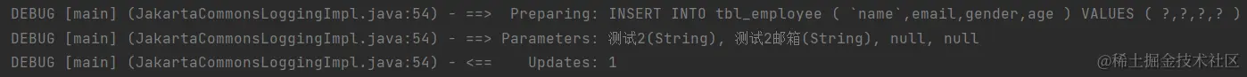 在这里我们需要注意,有很多人看到的日志可能还是有全部的值,那是因为在定义实体类的时候使用的是int定义并非Integer,而这两个关键字在使用的时候虽然没有太多区别,但是int定义变量,会给变量赋予一个默认值:0;而Integer并不会