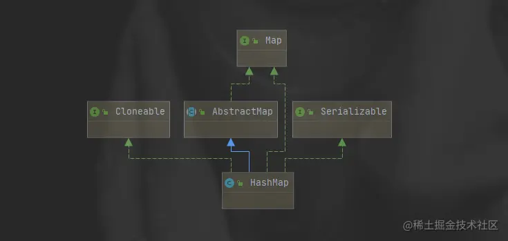 可以看到HashMap继承了AbstractMap抽象类实现了Map接口,但为什么说接口优先于抽象类呢?这些因为Java是单继承多实现,HashMap继承了AbstractMap抽象类之后就无法继承其他类了,如果是接口就没有这个限制,比如HashMap还需要提供序列化和克隆的功能,HashMap就可以实现三个接口Map<K,V>, Cloneable, Serializable。