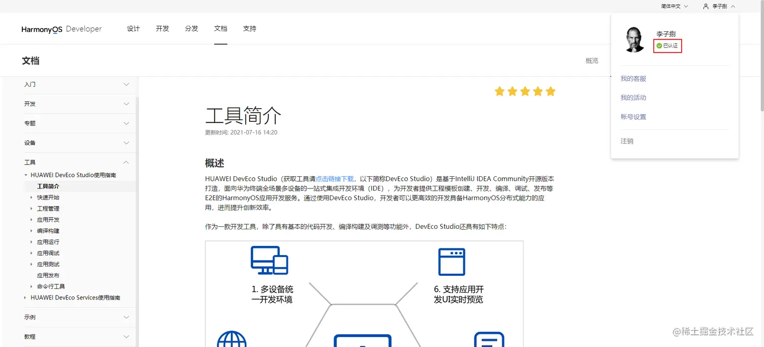 在进行鸿蒙开发之前,首先需要注册一个华为的账户,并且进行实名认证,认证的方式有身份证认证和银行卡认证,官方建议使用银行卡认证,认证速度快。认证通过后的效果如下所示: