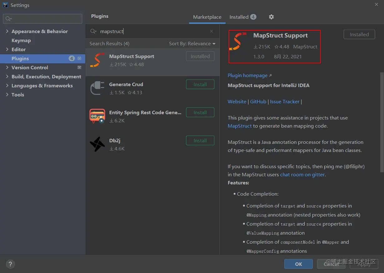 作为一款非常流行的对象映射工具,MapStruct还提供了专门的IDEA插件,我们在使用之前可以先安装好插件。