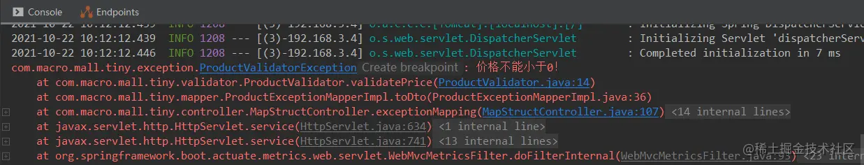 - 在Swagger中调用接口测试下,发现运行日志中已经打印了自定义异常信息。