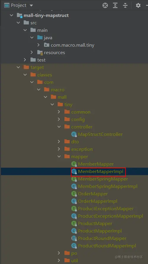 @Mapper和@Mapping等注解,在运行时生成接口的实现类,我们可以打开项目的target目录看下;