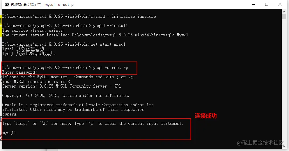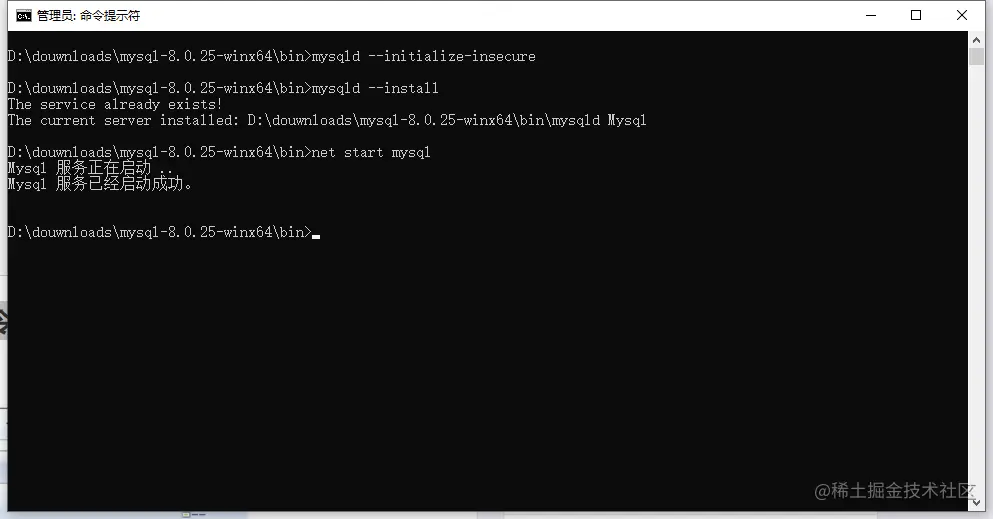 3、输入mysqld --install将mysql注册到Window服务中,如果提示已经存在则跳过