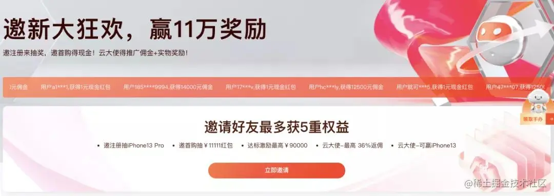 阿里云官网实名认证用户皆可参与,活动期间内有效拉新人数1名,即可获得1次抽取现金红包的机会,红包上不封顶。