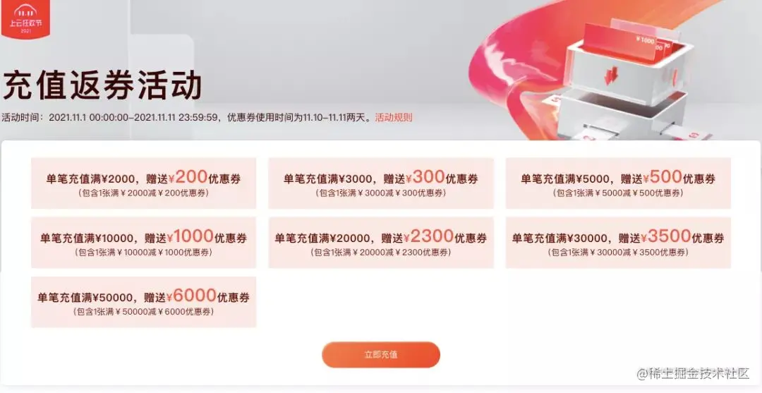 充值送优惠券活动时间:2021年11月1日0点至2021年11月11日24点