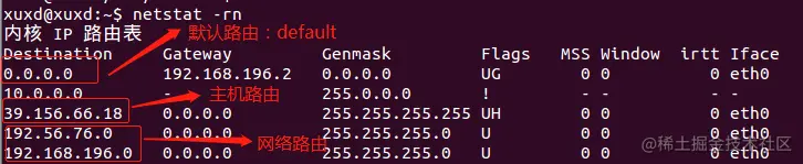 我自己的笔记本上,装了个虚拟机Ubuntu系统,路由表如下(使用了-n参数,不看网络名):