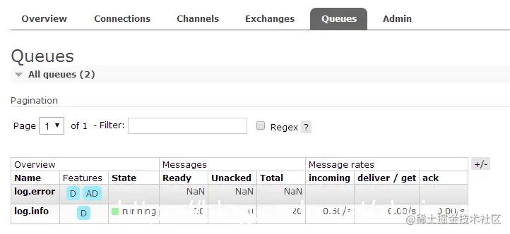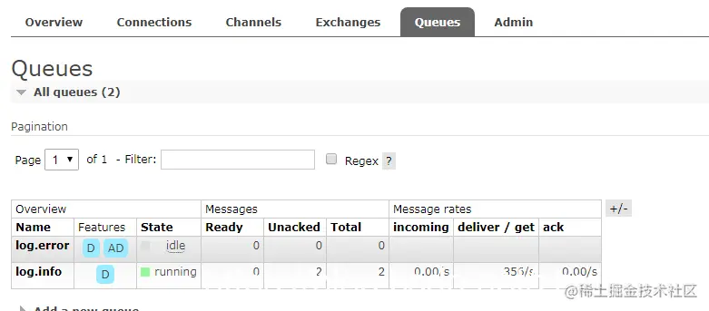 查看RabbitMQ管理后台,2个队列设置的autoDelete不同的结果就在于Features项,true会显示AD。