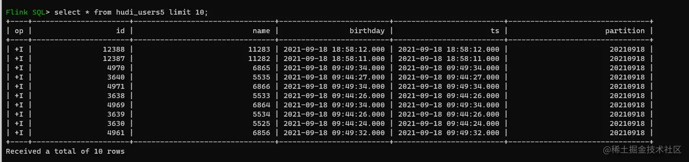partition) SELECT id,name,birthday,ts,DATE_FORMAT(birthday, 'yyyyMMdd') FROM mysql_users;