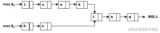 有一种存储英文单词的方法,是把单词的所有字母串在一个单链表上。为了节省一点空间,如果有两个单词有同样的后缀,就让它们共享这个后缀。下图给出了单词“loading”和“being”的存储形式。本题要求你找出两个链表的公共后缀。