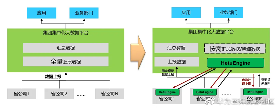 如上图所示,在旧模式下,所有的数据只能通过定时上报的方式收集到集团集中化大数据平台,再进行分析,供上层业务使用。引入HetuEngine后,上报的数据只是每天固定模型加工的数据,明细数据和临时汇总数据均可以通过HetuEngine进行实时的查询。通过HetuEngine不仅实现了高效的实时数据查询,还可以通过HetuEngine进行跨省公司的数据关联分析,打破了省公司之间的数据墙,大大提高了跨域数据分析的效率。