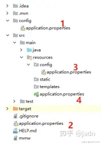 首先,当我们创建一个 Spring Boot 工程时,默认 resources 目录下就有一个 application.properties 文件,可以在 application.properties 文件中进行项目配置,但是这个文件并非唯一的配置文件,在 Spring Boot 中,一共有 4 个地方可以存放 application.properties 文件。