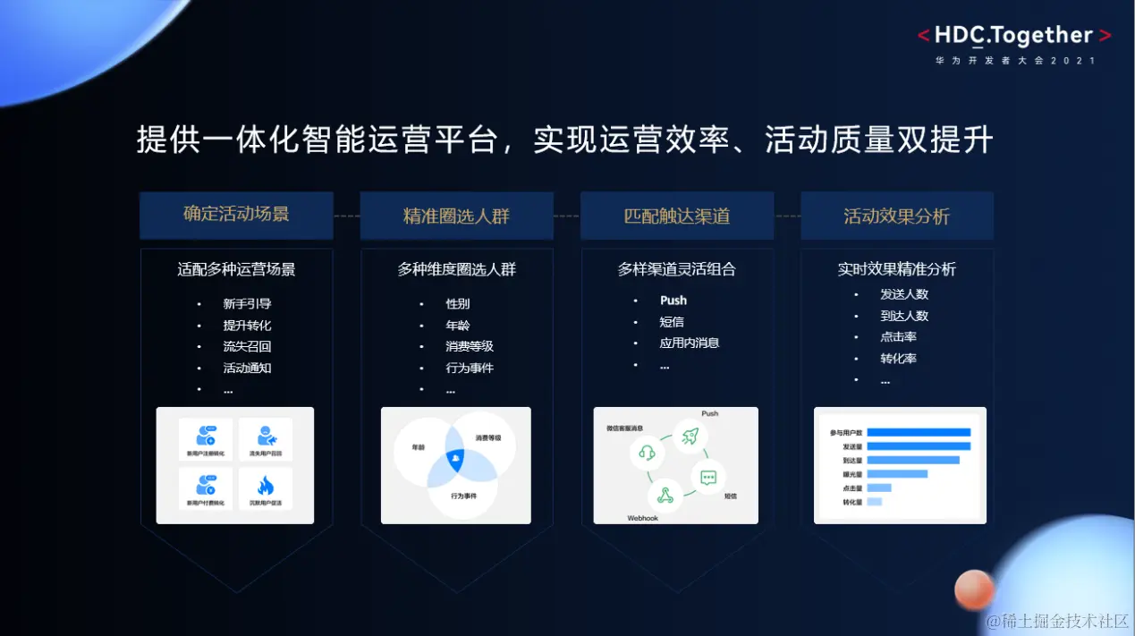 由华为分析服务团队全新打造的智能运营平台也在本次大会中亮相。依托于分析服务强大的数据根基,智能运营平台可根据业务场景需求帮助开发者实现全链路自动化营销触达,并通过一体化的效果分析,有效提升运营效率与质量。