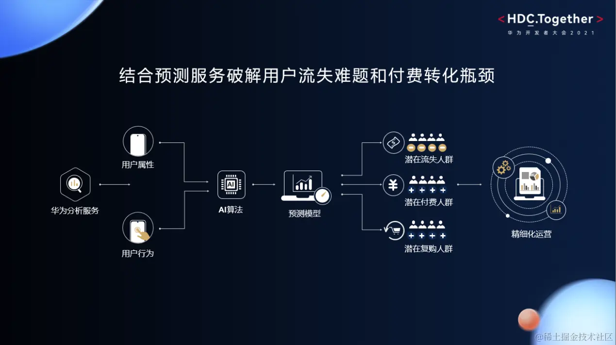 除实现用户已有应用内旅程的深度洞察,华为分析服务的预测能力,基于AI算法的强大预测模型更是能够帮助开发者精准预测潜在流失和付费人群,有效解决用户流失和付费转化难的运营痛点。
